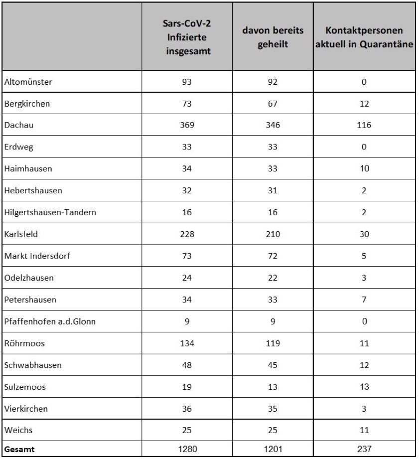 (ty) Die Corona-Lage im Kreis Dachau stellt sich laut aktueller Mitteilung des Landratsamts wie folgt dar: Bis zum heutigen Nachmittag (Stand: 16.30 Uhr) sind 1280 Infektions-Fälle registriert worden. 1201 der positiv auf den neuartigen Erreger getesteten Personen gelten mittlerweile als genesen. 37 Bürger, die mit dem Virus infiziert waren, sind gestorben – heute gab es einen weiteren Todesfall. Derzeit gibt es in dem Kreis 42 aktive Corona-Fälle. Der Sieben-Tage-Inzidenzwert für den Landkreis liege jetzt bei 22,74. Insgesamt 237 Landkreis-Bürger gelten aktuell als Kontakt-Personen der Kategorie 1 und befinden sich in häuslicher Quarantäne. Jüngste Zahlen aus sämtlichen Gemeinden gehen aus der unten stehenden Tabelle hervor.