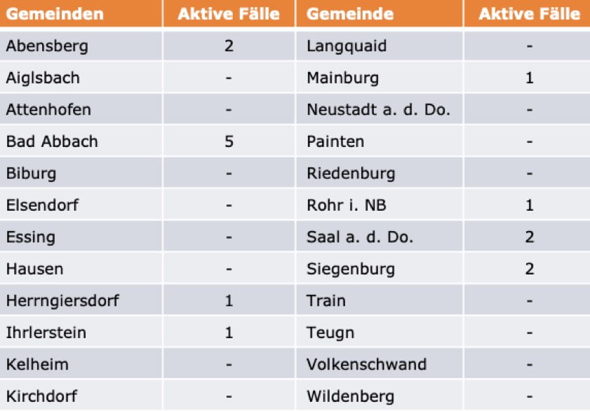 (ty) Im Kreis Kelheim gibt es, wie berichtet, in Zusammenhang mit der Corona-Pandemie bislang 34 Menschenleben zu beklagen. Die Zahl der bestätigten Corona-Fälle hat sich seit der offiziellen Meldung von gestern um drei erhöht. Unter Verweis auf Daten des Gesundheitsamts teilte das Landratsamt heute mit, dass – Stand gestern, 16 Uhr – die Zahl der im Kreis Kelheim positiv auf das neuartige Virus getesteten Menschen bei insgesamt 688 liegt. 639 hiesige Corona-Patienten – unverändert seit gestern – gelten mittlerweile als genesen und sind aus der Quarantäne entlassen. Das bedeutet: Derzeit gibt es 15 aktive Corona-Fälle (gestern: zwölf) im Landkreis. Zahlen aus den Gemeinden zeigt die Tabelle unten.