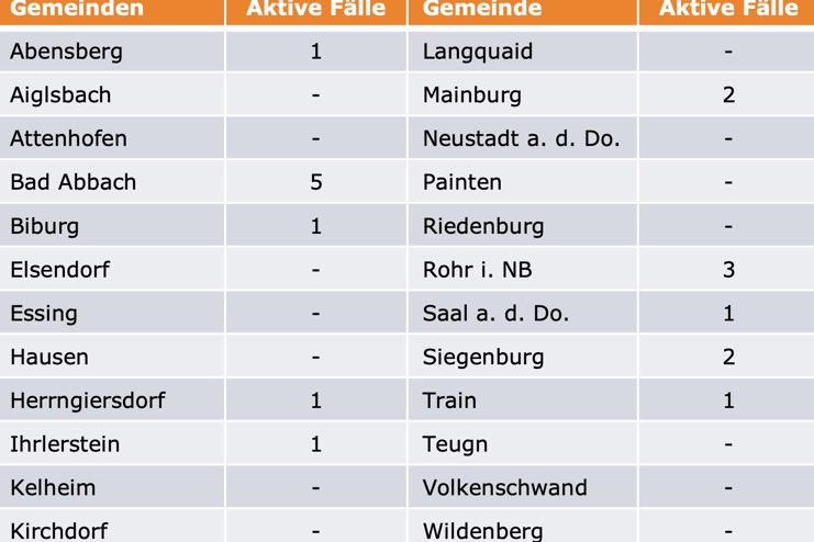 (ty) Im Kreis Kelheim gibt es, wie berichtet, in Zusammenhang mit der Corona-Pandemie bislang 34 Menschenleben zu beklagen. Die Zahl der bestätigten Corona-Fälle hat sich seit der offiziellen Meldung vom Freitag um vier erhöht. Unter Verweis auf Daten des Gesundheitsamts teilte das Landratsamt heute mit, dass – Stand gestern, 16 Uhr – die Zahl der im Kreis Kelheim positiv auf das neuartige Virus getesteten Menschen bei insgesamt 695 liegt. 643 hiesige Corona-Patienten – vier mehr als am Freitag gemeldet – gelten mittlerweile als genesen und sind aus der Quarantäne entlassen. Das bedeutet: Derzeit gibt es 18 aktive Corona-Fälle (Freitag: 18) im Landkreis. Zahlen aus den Gemeinden zeigt die Tabelle unten.