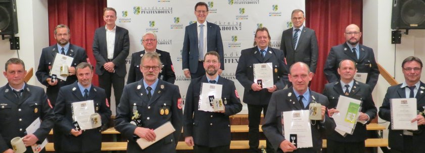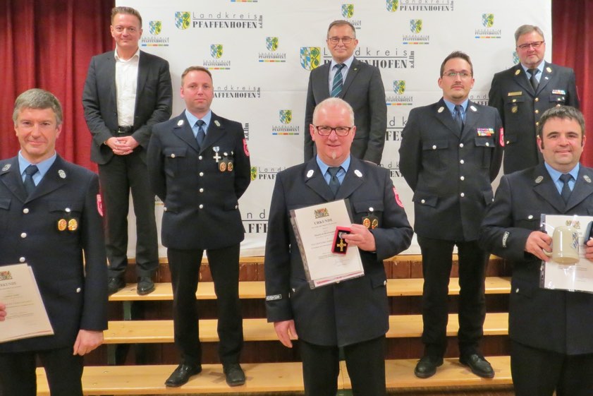 Die geehrten Feuerwehrler aus der Gemeinde Scheyern mit dem Abgeordneten Karl Straub, Vize-Landrat Karl Huber, Bürgermeister Manfred Sterz und Kreisbrandrat Armin Wiesbeck.