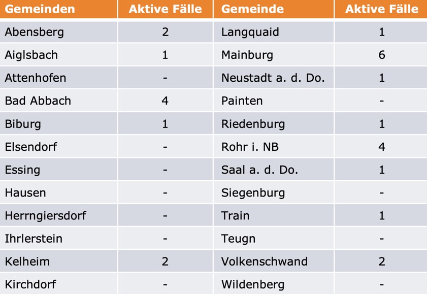(ty) Im Kreis Kelheim gibt es, wie berichtet, in Zusammenhang mit der Corona-Pandemie bislang 34 Menschenleben zu beklagen. Die Zahl der bestätigten Corona-Fälle hat sich seit der offiziellen Meldung von gestern um sieben erhöht. Unter Verweis auf Daten des Gesundheitsamts teilte das Landratsamt heute mit, dass – Stand gestern, 16 Uhr – die Zahl der im Kreis Kelheim positiv auf das neuartige Virus getesteten Menschen bei insgesamt 712 liegt. 651 hiesige Corona-Patienten – drei mehr als gestern gemeldet – gelten mittlerweile als genesen und sind aus der Quarantäne entlassen. Das bedeutet: Derzeit gibt es 27 aktive Corona-Fälle (gestern: 23) im Landkreis. Zahlen aus den Gemeinden zeigt die Tabelle unten.