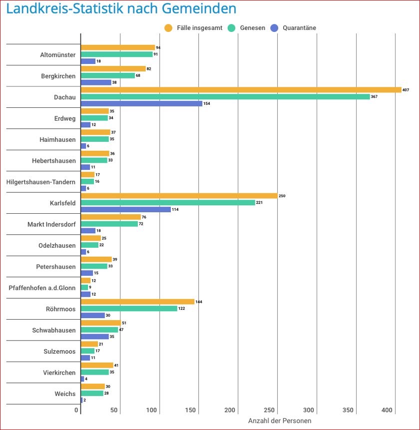 (ty) Am heutigen Freitag (Stand: 17 Uhr) sind im Kreis Dachau insgesamt 28 neue Corona-Infektionen gemeldet worden (Gemeinde-Daten siehe Grafik ganz unten). Insgesamt sind hier bislang 1397 Fälle registriert worden. 1250 der Betroffenen gelten bereits als genesen, 110 gelten als derzeit aktive Fälle. Insgesamt 37 Landkreis-Bürger, die positiv auf den neuartigen Erreger getestet worden waren, sind gestorben. Derzeit befinden sich 488 Menschen aus dem Landkreis als so genannte Kontakt-Personen der Kategorie 1 in häuslicher Quarantäne. Der Wert der Sieben-Tage-Inzidenz beträgt nach Berechnungen des hiesigen Gesundheitsamts momentan 58,48. Damit greifen die von der bayerischen Staatsregierung beschlossenen Regelungen für den Fall, dass die so genannten Corona-Ampel auf Rot springt. Eine neue Allgemein-Verfügung sei in Vorbereitung, wurde aus dem Landratsamt erklärt.