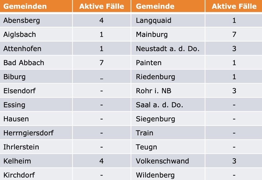 (ty) Im Kreis Kelheim gibt es, wie berichtet, in Zusammenhang mit der Corona-Pandemie bislang 34 Menschenleben zu beklagen. Die Zahl der bestätigten Corona-Fälle hat sich seit der offiziellen Meldung vom Freitag um 16 erhöht. Unter Verweis auf Daten des Gesundheitsamts teilte das Landratsamt heute mit, dass – Stand gestern, 16 Uhr – die Zahl der im Kreis Kelheim positiv auf das neuartige Virus getesteten Menschen bei insgesamt 728 liegt. 658 hiesige Corona-Patienten – sieben mehr als am Freitag gemeldet – gelten mittlerweile als genesen und sind aus der Quarantäne entlassen. Das bedeutet: Derzeit gibt es 36 aktive Corona-Fälle (Freitag: 27) im Landkreis. Zahlen aus den Gemeinden zeigt die Tabelle unten. Die Sieben-Tages-Inzidenz umgerechnet auf 100 000 Einwohner beträgt laut Robert-Koch-Institut (RKI) für den Landkreis derzeit 26,8.