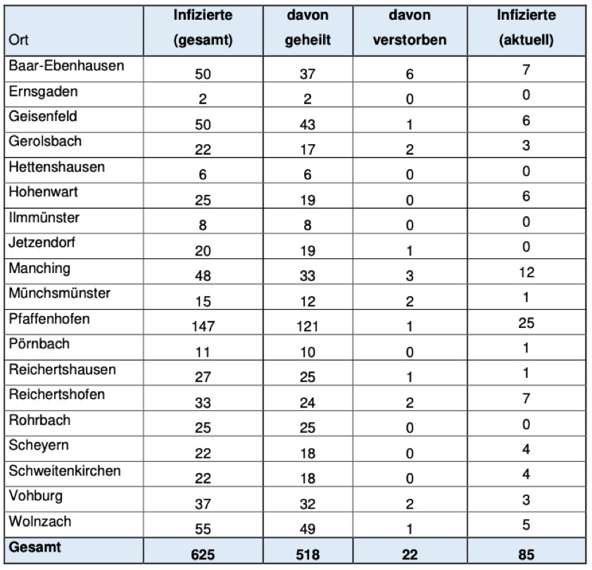Anmerkung zur heutigen Tabelle: Die Anzahl der Geheilten war am Freitag, 16. Oktober, vom Landratsamt Pfaffenhofen falsch übermittelt. Die Zahl wurde heute korrigiert. (Gerolsbach, Pfaffenhofen und Reichertshofen jeweils minus 1).