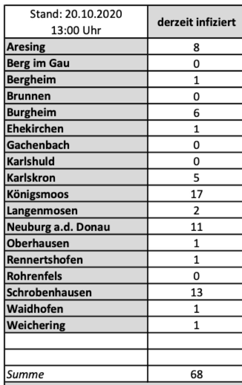 (ty) Die Corona-Lage im Kreis Neuburg-Schrobenhausen stellt sich laut aktueller Mitteilung aus dem Landratsamt wie folgt dar: Bislang – Stand: heute, 14 Uhr – wurden 549 Landkreis-Bürger positiv auf den neuartigen Erreger getestet. Die Zahl hat sich seit gestern um zehn erhöht. Von den Infizierten gelten mittlerweile 463 als genesen – das sind 21 mehr als noch gestern. 18 Personen, die positiv auf das Virus getestet worden waren, sind gestorben. Damit gibt es momentan 68 aktive Corona-Fälle (gestern: 79) im Landkreis. Zahlen aus den einzelnen Gemeinden finden Sie am Ende dieses Beitrags. Die Sieben-Tages-Inzidenz liegt für den Landkreis weiterhin deutlich über 50, deshalb steht die Corona-Ampel hier weiterhin auf "Rot" und es gelten strenge Regeln.