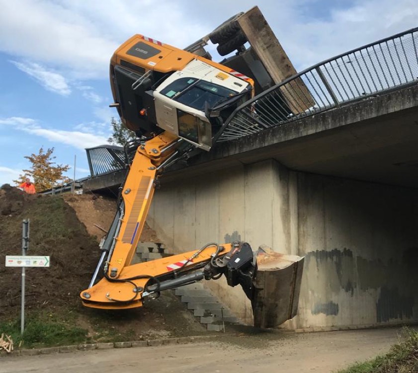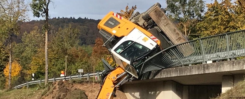 (ty) Ein spektakulärer Unfall hat sich am gestrigen Vormittag in Riedenburg (Landkreis Kelheim) ereignet. Ein Bagger ist auf der Staatsstraße 2230 bei Arbeiten umgekippt und schließlich sozusagen kopfüber an der Leitplanke oberhalb einer Unterführung hängen geblieben. Der 36 Jahre alte Bagger-Lenker hatte wohl einen Schutzengel an Bord: Er konnte sich laut Polizei selbstständig aus seinem Führerhaus retten und blieb unverletzt. Die Bergungs-Maßnahmen zogen sich über Stunden.