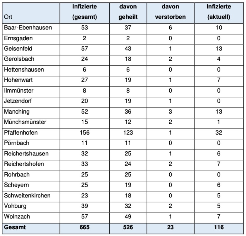 Jeweils wie viele Menschen aus welcher der insgesamt 19 Gemeinden im Landkreis Pfaffenhofen bislang positiv auf das Corona-Virus getestet worden sind, können Sie der tabellarischen Aufstellung in diesem Beitrag entnehmen, die auch heute wieder vom Pfaffenhofener Landratsamt herausgegeben worden ist. "Aufgrund der mittlerweile erhöhten Zahl der Infektionen ist ein unmittelbarer Zusammenhang zu einzelnen infizierten Personen nicht mehr herstellbar", hatte die Behörde dazu erklärt. "Die Persönlichkeitsrechte der Betroffenen sind daher weiterhin geschützt."