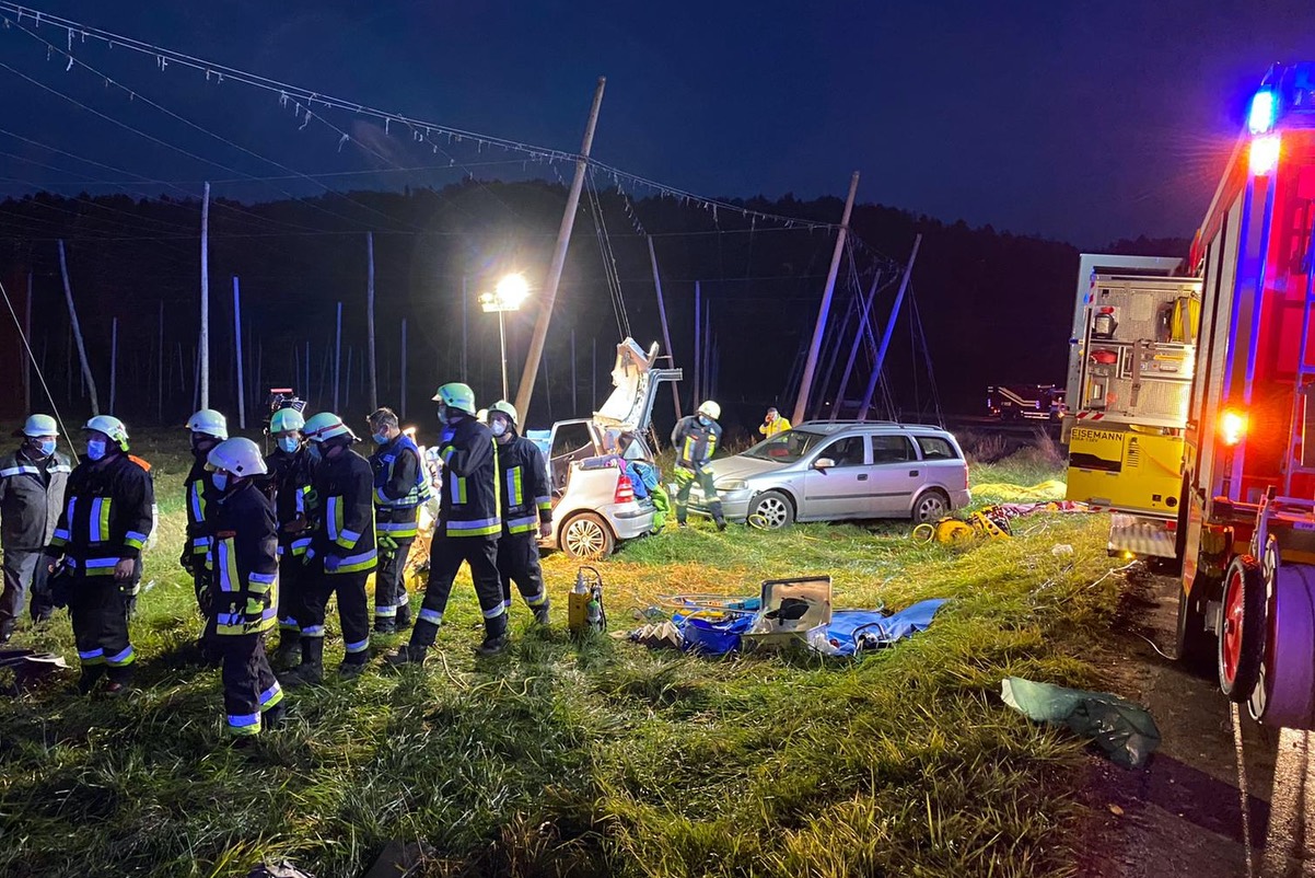 Hinter dem Pkw des Ehepaars war laut Polizei ein 61-jähriger Wolnzacher mit seinem Opel unterwegs. "Durch das abrupte Abbremsen infolge der Kollision konnte er trotz eines Ausweich-Manövers sein Fahrzeug nicht mehr rechtzeitig zum Stillstand bringen und fuhr noch leicht auf den Mercedes des Ehepaars auf", heißt es im Bericht der Geisenfelder Polizeiinspektion. Der 61-Jährige sei körperlich unversehrt geblieben. Der 18-Jährige sowie die beiden 72-Jährigen mussten von der Feuerwehr befreit werden. Die drei Schwerverletzten wurden nach der Erstversorgung vor Ort vom Rettungsdienst in verschiedene Krankenhäuser gebracht; dazu waren auch zwei Rettungs-Helikopter im Einsatz.
