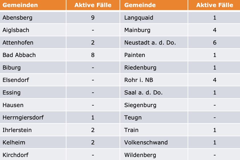 (ty) Im Kreis Kelheim gibt es in Zusammenhang mit der Corona-Pandemie, wie berichtet, bislang 35 Menschenleben zu beklagen. Die Zahl der bestätigten Corona-Fälle hat sich seit der offiziellen Meldung von gestern um sechs erhöht. Unter Verweis auf Daten des Gesundheitsamts teilte das Landratsamt heute mit, dass – Stand gestern, 16 Uhr – die Zahl der im Kreis Kelheim positiv auf das neuartige Virus getesteten Menschen bei insgesamt 749 liegt. 670 hiesige Corona-Patienten – vier mehr als gestern gemeldet – gelten mittlerweile als genesen und sind aus der Quarantäne entlassen. Das bedeutet: Derzeit gibt es 44 aktive Corona-Fälle (gestern: 42) im Landkreis. Zahlen aus den Gemeinden zeigt die Tabelle unten. Die Sieben-Tages-Inzidenz umgerechnet auf 100 000 Einwohner beträgt laut Robert-Koch-Institut (RKI) für den Landkreis derzeit 29,3.