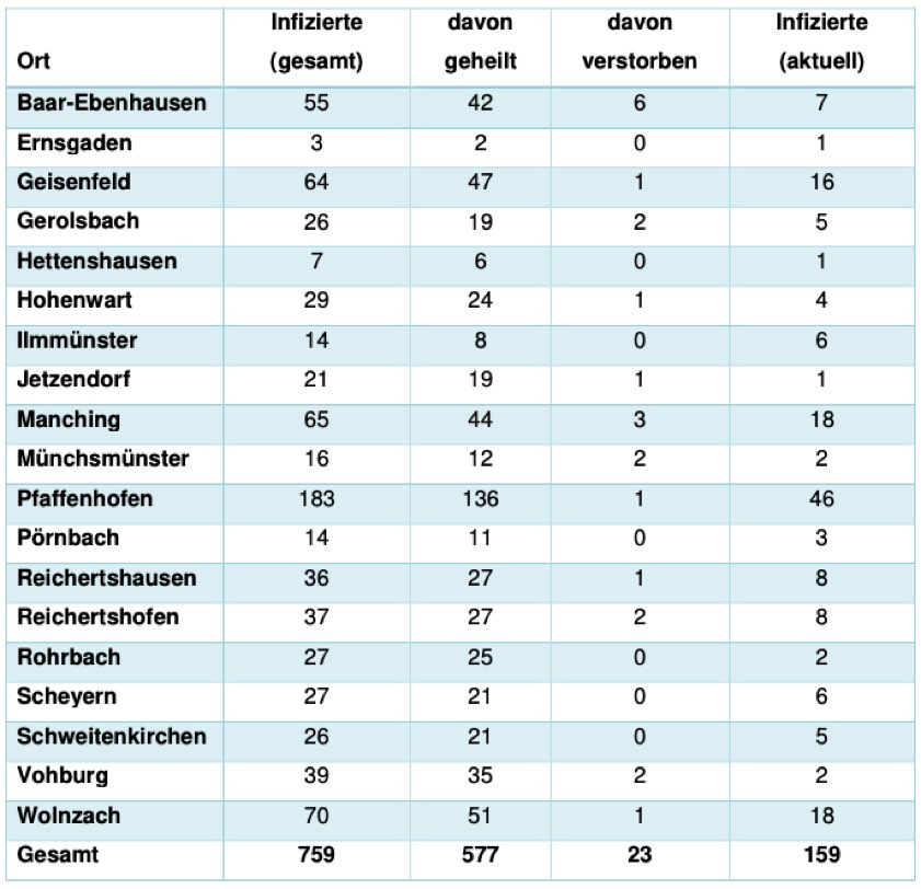 Jeweils wie viele Menschen aus welcher der insgesamt 19 Gemeinden im Landkreis Pfaffenhofen bislang positiv auf das Corona-Virus getestet worden sind, können Sie der tabellarischen Aufstellung in diesem Beitrag entnehmen, die auch heute wieder vom Pfaffenhofener Landratsamt herausgegeben worden ist. "Aufgrund der mittlerweile erhöhten Zahl der Infektionen ist ein unmittelbarer Zusammenhang zu einzelnen infizierten Personen nicht mehr herstellbar", hatte die Behörde dazu erklärt. "Die Persönlichkeitsrechte der Betroffenen sind daher weiterhin geschützt."