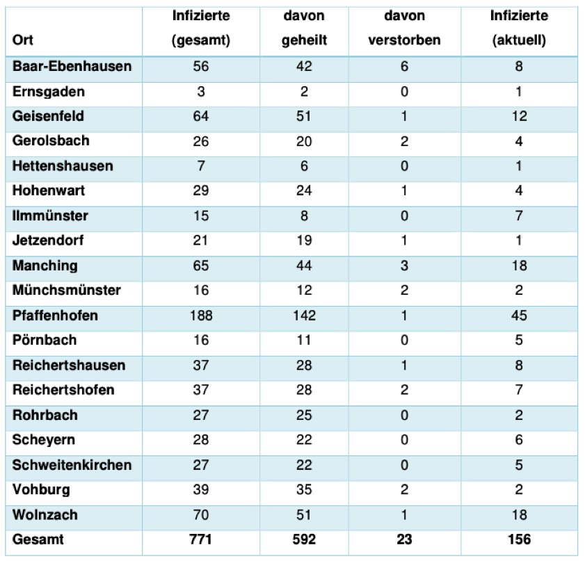 Jeweils wie viele Menschen aus welcher der insgesamt 19 Gemeinden im Landkreis Pfaffenhofen bislang positiv auf das Corona-Virus getestet worden sind, können Sie der tabellarischen Aufstellung in diesem Beitrag entnehmen, die auch heute wieder vom Pfaffenhofener Landratsamt herausgegeben worden ist. "Aufgrund der mittlerweile erhöhten Zahl der Infektionen ist ein unmittelbarer Zusammenhang zu einzelnen infizierten Personen nicht mehr herstellbar", hatte die Behörde dazu erklärt. "Die Persönlichkeitsrechte der Betroffenen sind daher weiterhin geschützt."