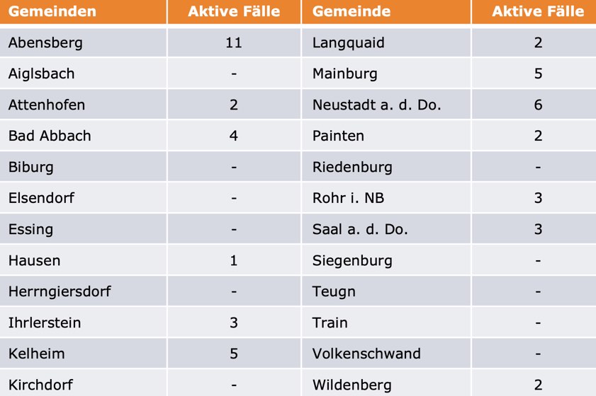 (ty) Im Kreis Kelheim gibt es in Zusammenhang mit der Corona-Pandemie, wie berichtet, bislang 35 Menschenleben zu beklagen. Die Zahl der bestätigten Corona-Fälle hat sich seit der offiziellen Meldung von gestern um 13 erhöht. Unter Verweis auf Daten des Gesundheitsamts teilte das Landratsamt heute mit, dass – Stand gestern, 16 Uhr – die Zahl der im Kreis Kelheim positiv auf das neuartige Virus getesteten Menschen bei insgesamt 784 liegt. 700 hiesige Corona-Patienten – sieben mehr als gestern gemeldet – gelten mittlerweile als genesen und sind aus der Quarantäne entlassen. Das bedeutet: Derzeit gibt es 49 aktive Corona-Fälle (gestern: 43) im Landkreis. Zahlen aus den einzelnen Gemeinden zeigt die Tabelle unten. Die Sieben-Tages-Inzidenz umgerechnet auf 100 000 Einwohner beträgt laut Robert-Koch-Institut (RKI) für den Landkreis derzeit 40,6.