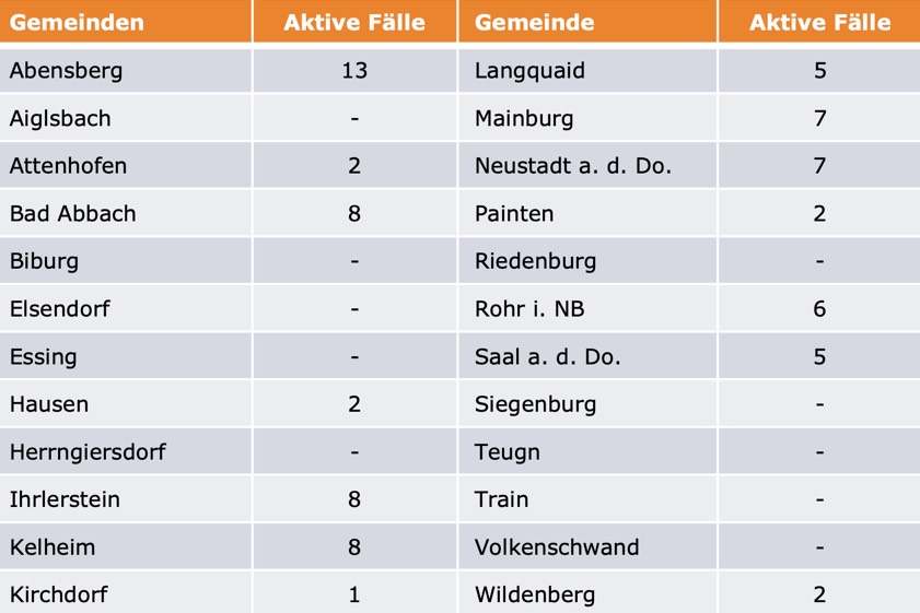 (ty) Im Kreis Kelheim gibt es in Zusammenhang mit der Corona-Pandemie, wie berichtet, bislang 35 Menschenleben zu beklagen. Die Zahl der bestätigten Corona-Fälle hat sich seit der offiziellen Meldung von gestern um 29 erhöht. Unter Verweis auf Daten des Gesundheitsamts teilte das Landratsamt heute mit, dass – Stand gestern, 16 Uhr – die Zahl der im Kreis Kelheim positiv auf das neuartige Virus getesteten Menschen bei insgesamt 813 liegt. 702 hiesige Corona-Patienten – zwei mehr als gestern gemeldet – gelten mittlerweile als genesen und sind aus der Quarantäne entlassen. Das bedeutet: Derzeit gibt es 76 aktive Corona-Fälle (gestern: 49) im Landkreis. Zahlen aus den einzelnen Gemeinden zeigt die Tabelle unten. Die Sieben-Tages-Inzidenz umgerechnet auf 100 000 Einwohner beträgt laut Robert-Koch-Institut (RKI) für den Landkreis derzeit 56,9 (Stand: heute, 0 Uhr) – damit droht nun sogar Ampel-Stufe "rot".