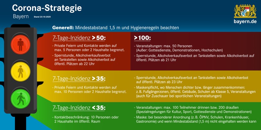 Wenn die Überschreitung einer Inzidenz-Stufe (35, 50, 100) auf der Homepage des bayerischen Gesundheits-Ministeriums (www.stmgp.bayern.de) erstmals genannt wird, gelten ab dem darauf folgenden Tag die Regelungen, wie sie in der aktuellen Infektions-Schutz-Maßnahmen-Verordnung der bayerischen Staatsregierung für Landkreise und kreisfreie Städte (Corona-Ampel) vorgesehen sind, die die jeweiligen Inzidenz-Werte überschreiten.
