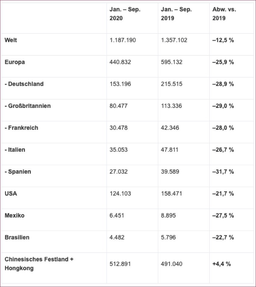 Die Umsatzerlöse erreichten aufgrund der negativen Auswirkungen der Corona-Pandemie auf die Märkte und Verkäufe 33,26 Milliarden Euro (Vorjahres-Zeitraum: 41,33 Milliarden). Positiv wirkten die gute Umsatz-Entwicklung einzelner Modelle, wie etwa des vollelektrischen E-tron, sowie vor dem Hintergrund des starken China-Geschäfts höhere Umsätze aus Teilesatz-Lieferungen für die lokale Fertigung. Im dritten Quartal spiegelt sich nach Unternehmens-Angaben der positive Trend in den Märkten auch in um 1,7 Prozent höheren Umsätzen im Vergleich zum Vorjahres-Quartal wider (12,79 Milliarden nach 12,57 Milliarden Euro).