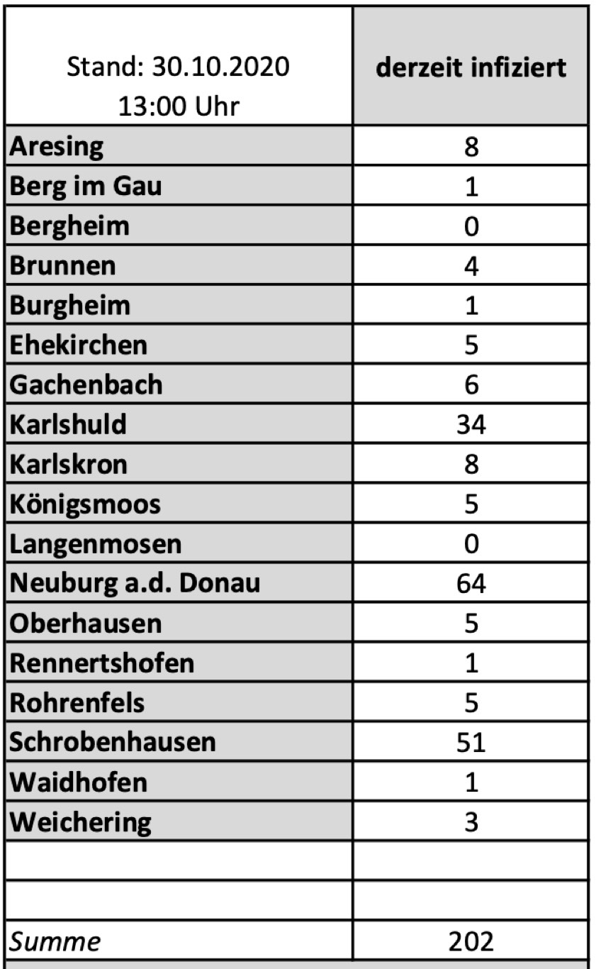 (ty) Die Corona-Lage im Kreis Neuburg-Schrobenhausen stellt sich laut aktueller Mitteilung aus dem Landratsamt wie folgt dar: Bislang – Stand: heute, 12 Uhr – wurden 768 Landkreis-Bürger positiv auf den neuartigen Erreger getestet. Die Zahl hat sich seit der gestrigen Meldung um 33 erhöht. Von den Infizierten gelten mittlerweile 548 als genesen – 27 mehr als gestern. 18 Personen, die positiv auf das Virus getestet worden waren, sind gestorben. Damit gibt es momentan 202 aktive Corona-Fälle (gestern: 196) im Landkreis. Zahlen aus den Gemeinden zeigt die Tabelle unten. Die Sieben-Tages-Inzidenz liegt für den Kreis weiterhin über 100. Damit gilt im Landkreis, wie berichtet, nach wie vor die "dunkelrote" Stufe der bayerischen Corona-Ampel mit noch weiter verschärften Regeln.