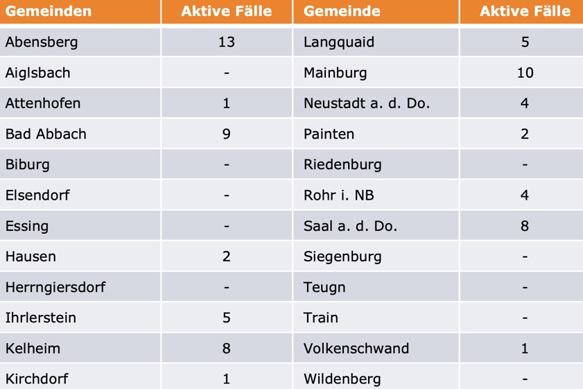 (ty) Im Kreis Kelheim gibt es in Zusammenhang mit der Corona-Pandemie, wie berichtet, bislang 35 Menschenleben zu beklagen. Die Zahl der bestätigten Corona-Fälle hat sich seit der offiziellen Meldung von gestern um sieben erhöht. Unter Verweis auf Daten des Gesundheitsamts teilte das Landratsamt heute mit, dass – Stand gestern, 16 Uhr – die Zahl der im Kreis Kelheim positiv auf das neuartige Virus getesteten Menschen bei insgesamt 832 liegt. 724 hiesige Corona-Patienten – 13 mehr als gestern gemeldet – gelten mittlerweile als genesen und sind aus der Quarantäne entlassen. Das bedeutet: Derzeit gibt es 73 aktive Corona-Fälle (gestern: 79) im Landkreis. Zahlen aus den einzelnen Gemeinden zeigt die Tabelle unten. Weiterhin gilt die "rote" Stufe der bayerischen Corona-Ampel für den Landkreis.