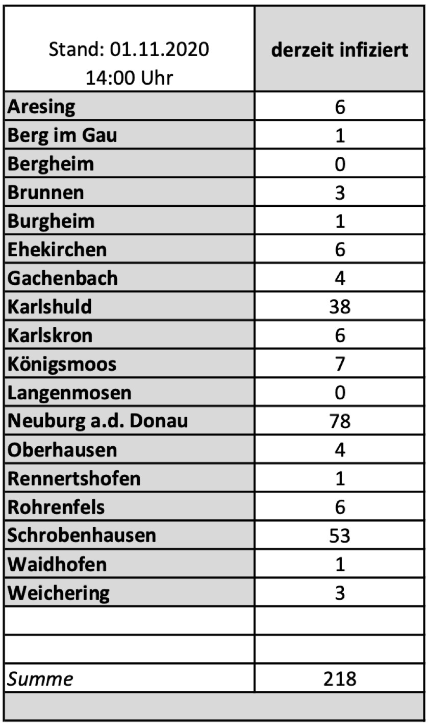 (ty) Die Corona-Lage im Kreis Neuburg-Schrobenhausen stellt sich laut aktueller Mitteilung aus dem Landratsamt wie folgt dar: Bislang – Stand: heute, 14 Uhr – wurden 815 Landkreis-Bürger positiv auf den neuartigen Erreger getestet. Die Zahl hat sich seit der gestrigen Meldung um zehn erhöht. Von den Infizierten gelten mittlerweile 579 als genesen – 19 mehr als gestern. 18 Personen, die positiv auf das Virus getestet worden waren, sind gestorben. Damit gibt es momentan 218 aktive Corona-Fälle (gestern: 227) im Landkreis. Zahlen aus den Gemeinden zeigt die Tabelle unten. Die Sieben-Tages-Inzidenz liegt für den Kreis weiterhin über 100. Damit gilt im Landkreis, wie berichtet, nach wie vor die "dunkelrote" Stufe der bayerischen Corona-Ampel mit noch weiter verschärften Regeln.