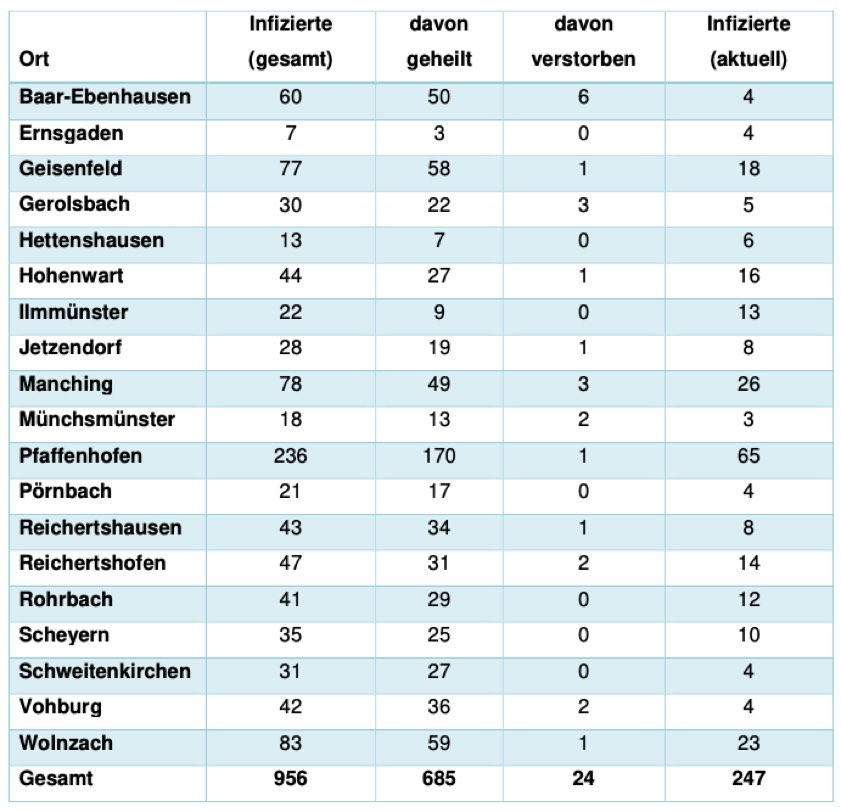 Jeweils wie viele Menschen aus welcher der insgesamt 19 Gemeinden im Landkreis Pfaffenhofen bislang positiv auf das Corona-Virus getestet worden sind, können Sie der tabellarischen Aufstellung in diesem Beitrag entnehmen, die auch heute wieder vom Pfaffenhofener Landratsamt herausgegeben worden ist. "Aufgrund der mittlerweile erhöhten Zahl der Infektionen ist ein unmittelbarer Zusammenhang zu einzelnen infizierten Personen nicht mehr herstellbar", hatte die Behörde dazu erklärt. "Die Persönlichkeitsrechte der Betroffenen sind daher weiterhin geschützt."