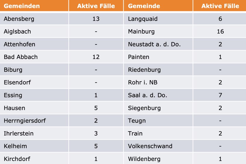 (ty) Im Kreis Kelheim gibt es in Zusammenhang mit der Corona-Pandemie, wie berichtet, bislang 35 Menschenleben zu beklagen. Die Zahl der bestätigten Corona-Fälle hat sich seit der offiziellen Meldung von gestern um 15 erhöht. Unter Verweis auf Daten des Gesundheitsamts teilte das Landratsamt heute mit, dass – Stand gestern, 16 Uhr – die Zahl der im Kreis Kelheim positiv auf das neuartige Virus getesteten Menschen bei insgesamt 872 liegt. 756 hiesige Corona-Patienten – elf mehr als gestern gemeldet – gelten mittlerweile als genesen und sind aus der Quarantäne entlassen. Das bedeutet: Derzeit gibt es 81 aktive Corona-Fälle (gestern: 77) im Landkreis. Zahlen aus den einzelnen Gemeinden zeigt die Tabelle unten. Seit gestern gilt in Bayern ein Teil-Lock-Down.