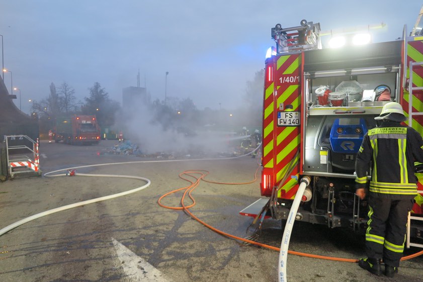 (ty) Eine in Brand geratene Lastwagen-Ladung mit Restmüll hatten die Einsatzkräfte von der Freisinger Feuerwehr am heutigen Morgen zu löschen. Beim Ausleeren von Containern auf dem Wertstoffhof sei der Lkw-Besatzung gegen 6.20 Uhr die brennende Ladung aufgefallen, berichtet ein Feuerwehr-Sprecher. Kurzerhand habe der Lkw-Lenker daraufhin den Inhalt des Lasters auf eine Freifläche in der Mitte des Areals gekippt. Das Müllfahrzeug nahm laut Feuerwehr-Angaben durch den Brand keinen Schaden, es konnte rechtzeitig in Sicherheit gebracht werden.