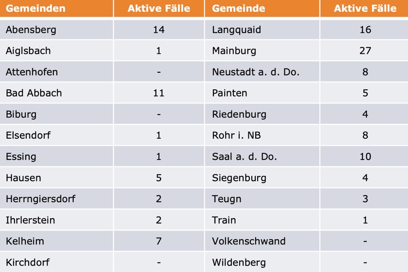 (ty) Im Kreis Kelheim gibt es in Zusammenhang mit der Corona-Pandemie, wie berichtet, bislang 35 Menschenleben zu beklagen. Die Zahl der bestätigten Corona-Fälle hat sich seit der offiziellen Meldung von gestern um 32 erhöht. Unter Verweis auf Daten des Gesundheitsamts teilte das Landratsamt heute mit, dass – Stand gestern, 16 Uhr – die Zahl der im Kreis Kelheim positiv auf das neuartige Virus getesteten Menschen bei insgesamt 960 liegt. 795 hiesige Corona-Patienten – 14 mehr als gestern gemeldet – gelten mittlerweile als genesen und sind aus der Quarantäne entlassen. Das bedeutet: Derzeit gibt es 130 aktive Corona-Fälle (gestern: 112) im Landkreis. Zahlen aus den einzelnen Gemeinden zeigt die Tabelle unten. Seit Montag gilt in Bayern ein Teil-Lock-Down.