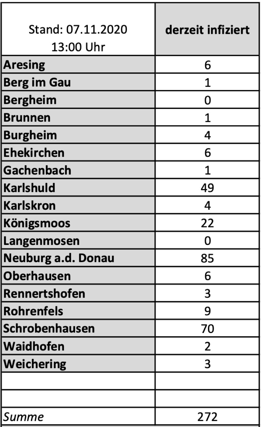 (ty) Im Kreis Neuburg-Schrobenhausen gibt es in Zusammenhang mit der Pandemie erneut zwei weitere Menschenleben zu beklagen. Das wurde am heutigen Samstag aus dem Landratsamt gemeldet. Die Corona-Situation im Kreis stellt sich laut aktueller Mitteilung aus der Behörde wie folgt dar: Bislang – Stand: heute, 13 Uhr – wurden 962 Landkreis-Bürger positiv auf den neuartigen Erreger getestet. Die Zahl hat sich seit der gestrigen Meldung um 23 erhöht. Von den Infizierten gelten mittlerweile 668 als genesen – das sind 20 mehr als gestern. 22 Personen, die positiv auf das Virus getestet worden waren, sind gestorben. Damit gibt es momentan 272 aktive Corona-Fälle (gestern: 271) im Landkreis. Zahlen aus den Gemeinden zeigt die Tabelle unten.
