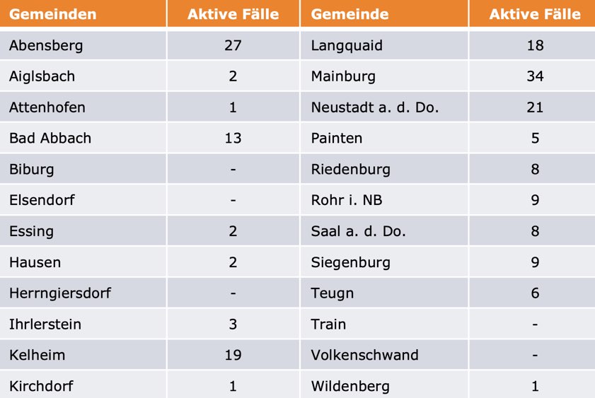 (ty) Im Kreis Kelheim gibt es in Zusammenhang mit der Corona-Pandemie, wie berichtet, bislang 35 Menschenleben zu beklagen. Die Zahl der bestätigten Corona-Fälle hat sich seit der offiziellen Meldung von gestern um 53 erhöht. Unter Verweis auf Daten des Gesundheitsamts teilte das Landratsamt heute mit, dass – Stand gestern, 16 Uhr – die Zahl der im Kreis Kelheim positiv auf das neuartige Virus getesteten Menschen bei insgesamt 1099 liegt. 875 hiesige Corona-Patienten gelten mittlerweile als genesen und sind aus der Quarantäne entlassen. Das bedeutet: Derzeit gibt es 189 aktive Corona-Fälle (gestern: 160) im Landkreis. Zahlen aus den einzelnen Gemeinden zeigt die Tabelle unten. Seit 2. November gilt in Bayern ein Teil-Lock-Down.