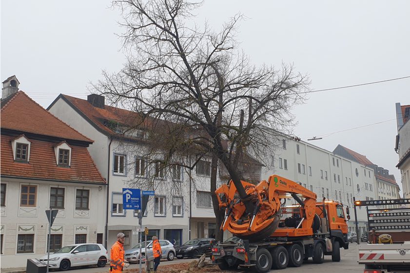 Zehn Meter hohe Sommerlinde wurde mit Spezialgerät von der Auenstraße auf einen Spielplatz an der Herzog-Albrecht-Straße versetzt.