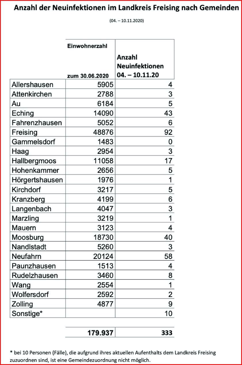 (ty) Die Corona-Situation im Kreis Freising stellt sich nach jüngsten offiziellen Informationen wie folgt dar: Bislang – Stand: heute, 14 Uhr, sind insgesamt 2346 Landkreis-Bürger positiv auf den neuartigen Erreger getestet worden. Von den Betroffenen gelten mittlerweile 1820 wieder als genesen. 49 Landkreis-Bürger, die bestätigt mit dem Corona-Virus infiziert waren, sind gestorben. Zuletzt wurden binnen einer Woche (4. bis 10. November) insgesamt 333 Neuinfektionen im Landkreis registriert. Vor diesem Hintergrund veröffentlichte die Kreisbehörde heute eine Tabelle (siehe unten), aus der das jüngste Infektions-Geschehen in den einzelnen Gemeinden hervorgeht.