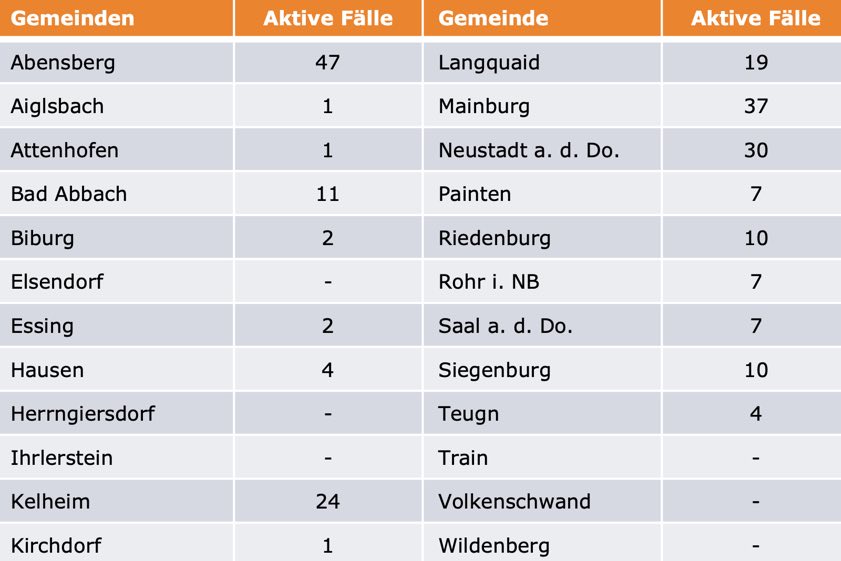 (ty) Im Kreis Kelheim gibt es in Zusammenhang mit der Corona-Pandemie, wie berichtet, bislang 35 Menschenleben zu beklagen. Die Zahl der bestätigten Corona-Fälle hat sich seit der offiziellen Meldung von gestern um 25 erhöht. Unter Verweis auf Daten des Gesundheitsamts teilte das Landratsamt heute mit, dass – Stand gestern, 16 Uhr – die Zahl der im Kreis Kelheim positiv auf das neuartige Virus getesteten Menschen bei insgesamt 1192 liegt. 933 hiesige Corona-Patienten gelten mittlerweile als genesen (gestern: 927) und sind aus der Quarantäne entlassen. Das bedeutet: Derzeit gibt es 224 aktive Corona-Fälle (gestern: 205) im Landkreis. Zahlen aus den einzelnen Gemeinden zeigt die Tabelle unten. Seit 2. November gilt in Bayern ein Teil-Lock-Down.