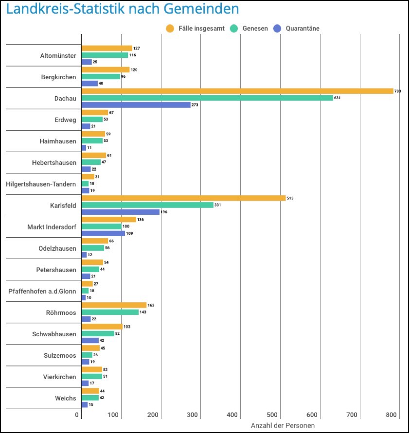 (ty) Im Zusammenhang mit der Corona-Pandemie gibt es im Kreis Dachau drei weitere – und damit mittlerweile insgesamt 53 – Menschenleben zu beklagen. Wie das Landratsamt außerdem mitteilte, sind dem hiesigen Gesundheitsamt am heutigen Freitag (Stand: 16.30 Uhr) über 70 neue Infektionsfälle gemeldet worden. Demnach erhöht sich die Zahl der Landkreis-Bürger, die positiv auf den neuartigen Erreger getestet worden sind, auf 2451. Davon gelten 1907 Personen bereits als genesen, 491 gelten aktuell als infiziert. Insgesamt 878 Landkreis-Bürger befinden sich derzeit in häuslicher Quarantäne. Zahlen aus den einzelnen Gemeinden gehen aus der Grafik am Ende dieses Beitrags hervor. Lokaler Hotspot bleibt eine Senioren-Einrichtung in Karlsfeld mit mehr als 100 Infektionsfällen; hier starben bereits 13 Corona-Infizierte.