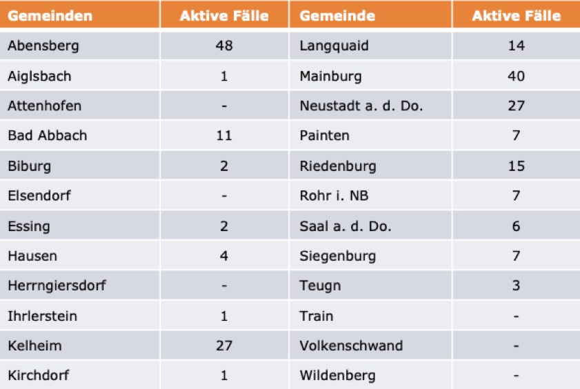 (ty) Im Kreis Kelheim gibt es in Zusammenhang mit der Corona-Pandemie, wie berichtet, bislang 35 Menschenleben zu beklagen. Die Zahl der bestätigten Corona-Fälle hat sich seit der offiziellen Meldung von gestern um 26 erhöht. Unter Verweis auf Daten des Gesundheitsamts teilte das Landratsamt heute mit, dass – Stand gestern, 16 Uhr – die Zahl der im Kreis Kelheim positiv auf das neuartige Virus getesteten Menschen bei insgesamt 1218 liegt. 960 hiesige Corona-Patienten gelten mittlerweile als genesen (gestern: 933) und sind aus der Quarantäne entlassen. Das bedeutet: Derzeit gibt es 223 aktive Corona-Fälle (gestern: 224) im Landkreis. Zahlen aus den einzelnen Gemeinden zeigt die Tabelle unten. Seit 2. November gilt in Bayern ein Teil-Lock-Down.