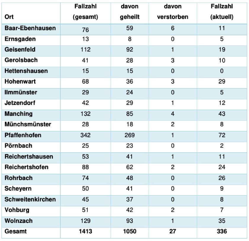 Jeweils wie viele Menschen aus welcher der insgesamt 19 Gemeinden im Landkreis Pfaffenhofen bislang positiv auf das Corona-Virus getestet worden sind, können Sie der tabellarischen Aufstellung in diesem Beitrag entnehmen, die auch heute wieder vom Pfaffenhofener Landratsamt herausgegeben worden ist. "Aufgrund der mittlerweile erhöhten Zahl der Infektionen ist ein unmittelbarer Zusammenhang zu einzelnen infizierten Personen nicht mehr herstellbar", hatte die Behörde dazu erklärt. "Die Persönlichkeitsrechte der Betroffenen sind daher weiterhin geschützt."