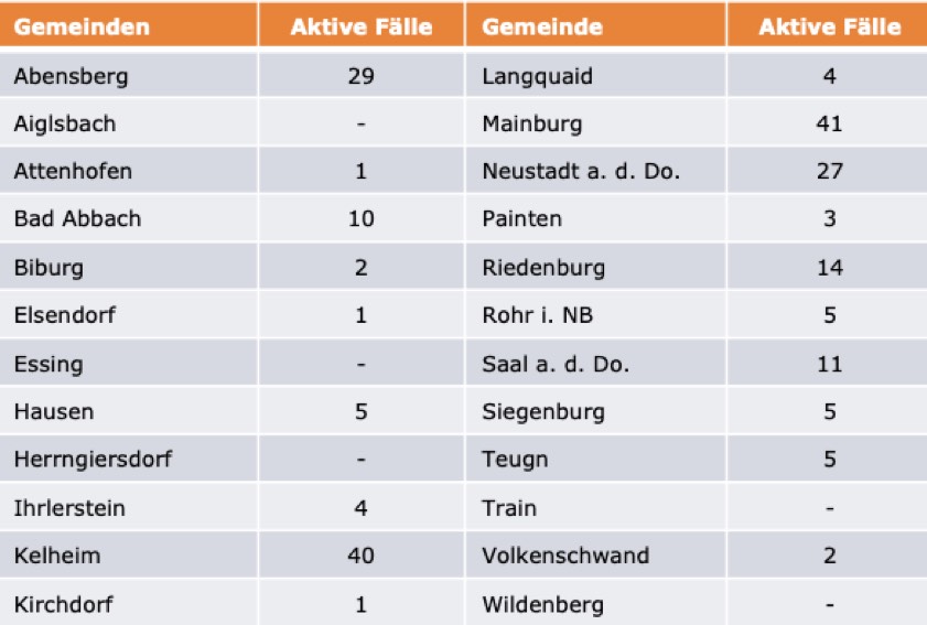 (ty) Im Kreis Kelheim gibt es in Zusammenhang mit der Corona-Pandemie, wie berichtet, mittlerweile 37 Menschenleben zu beklagen. Unter Verweis auf Daten des Gesundheitsamts teilte das Landratsamt heute mit, dass – Stand gestern, 16 Uhr – die Zahl der im Kreis Kelheim positiv auf den neuartigen Erreger getesteten Menschen bei insgesamt 1380 liegt – das sind 40 mehr als gestern gemeldet. 1133 hiesige Corona-Patienten (gestern: 1102) gelten mittlerweile als genesen und sind aus der Quarantäne entlassen. Derzeit gibt es 210 aktive Corona-Fälle im Landkreis (gestern: 201). Zahlen aus den einzelnen Gemeinden zeigt die Tabelle unten.