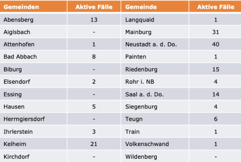 (ty) Im Kreis Kelheim gibt es in Zusammenhang mit der Corona-Pandemie, wie berichtet, mittlerweile 37 Menschenleben zu beklagen. Unter Verweis auf Daten des Gesundheitsamts teilte das Landratsamt heute mit, dass – Stand gestern, 16 Uhr – die Zahl der im Kreis Kelheim positiv auf den neuartigen Erreger getesteten Menschen bei insgesamt 1447 liegt – das sind 17 mehr als gestern gemeldet. 1239 hiesige Corona-Patienten (gestern: 1209) gelten mittlerweile als genesen und sind aus der Quarantäne entlassen. Derzeit gibt es 171 aktive Corona-Fälle im Landkreis (gestern: 184). Zahlen aus den einzelnen Gemeinden zeigt die Tabelle unten.