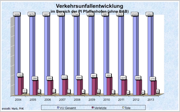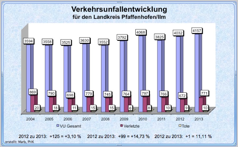 Im Zuständigkeitsbereich der Polizeiinspektion Pfaffenhofen (ohne Autobahn) ereigneten sich im Jahr 2013 insgesamt 1952 (Vorjahr: 2025) Unfälle. Dabei wurden insgesamt 279 (298) Menschen verletzt und sechs (vier) getötet. Die Alkoholunfälle verringerten sich um fast 21 Prozent von 29 auf 23. Freizeit- und Schulwegunfälle sowie Verkehrsunfälle unter Drogeneinfluss mussten keine aufgenommen werden.