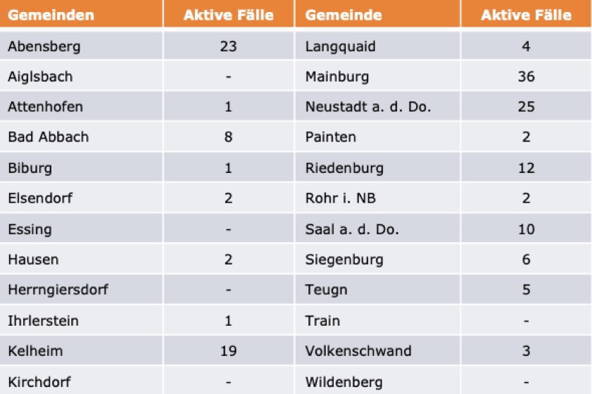 (ty) Im Kreis Kelheim gibt es in Zusammenhang mit der Corona-Pandemie, wie berichtet, mittlerweile 39 Menschenleben zu beklagen. Unter Verweis auf Daten des Gesundheitsamts teilte das Landratsamt heute mit, dass – Stand gestern, 16 Uhr – die Zahl der im Kreis Kelheim positiv auf den neuartigen Erreger getesteten Menschen bei insgesamt 1506 liegt – das sind 24 mehr als gestern gemeldet. 1305 hiesige Corona-Patienten (gestern: 1286) gelten mittlerweile als genesen und sind aus der Quarantäne entlassen. Derzeit gibt es 162 aktive Corona-Fälle im Landkreis (gestern: 157). Zahlen aus den einzelnen Gemeinden zeigt die Tabelle unten.