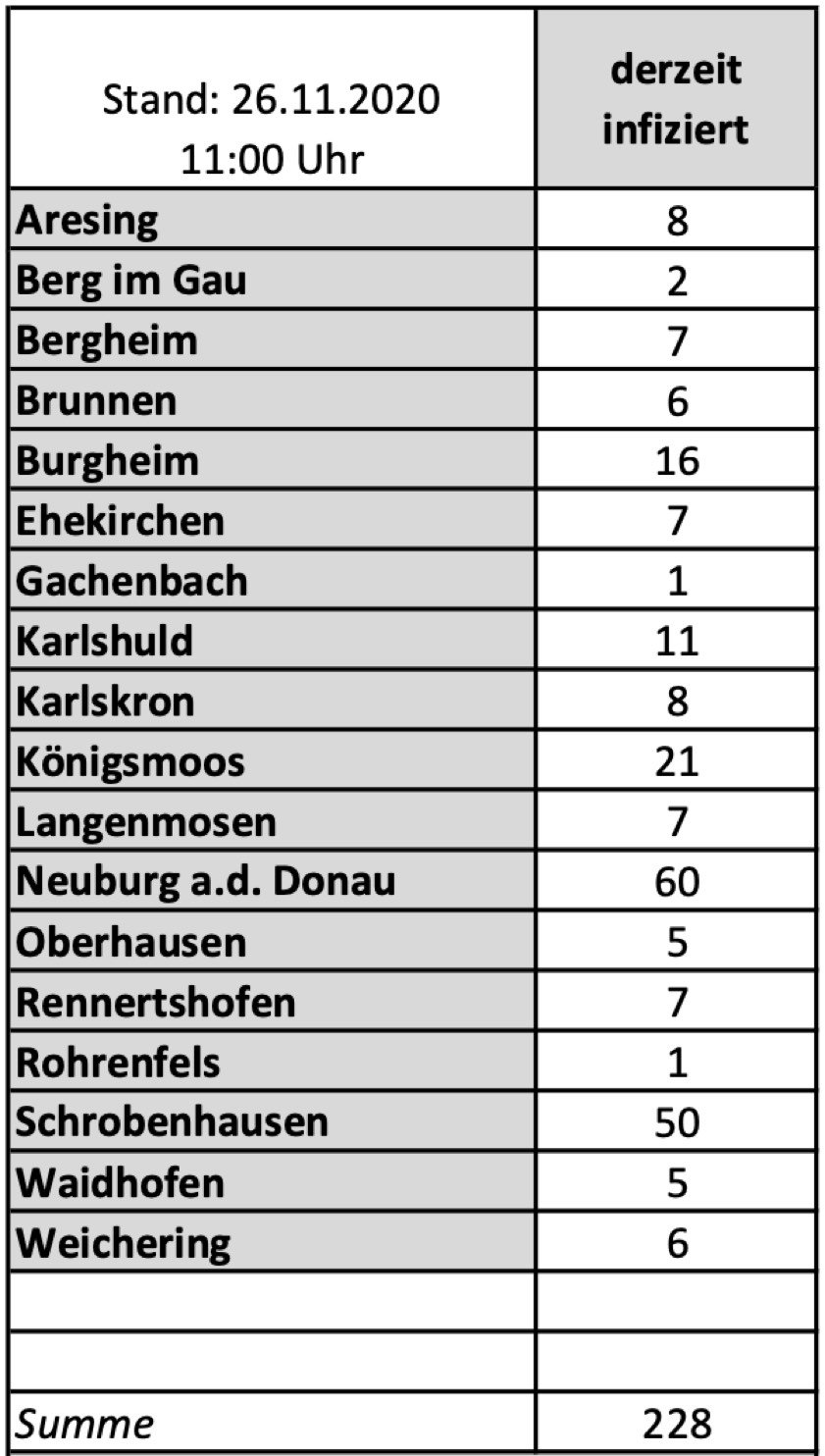 (ty) Im Kreis Neuburg-Schrobenhausen gibt es in Zusammenhang mit der Corona-Pandemie, wie berichtet, mittlerweile 37 Menschenleben zu beklagen. Die weitere Situation in dem Kreis stellt sich nach Angaben des Landratsamts wie folgt dar: Bislang – Stand: heute, 11 Uhr – wurden 1318 Landkreis-Bürger positiv auf den neuartigen Erreger getestet. Die Zahl hat sich seit der gestrigen Meldung um 18 erhöht. Von den Infizierten gelten mittlerweile 1053 als genesen; das sind drei mehr als gestern. Momentan gibt es in dem Landkreis 228 aktive Corona-Fälle (gestern: 213). Aktuelle Zahlen aus den Gemeinden zeigt die Tabelle unten.