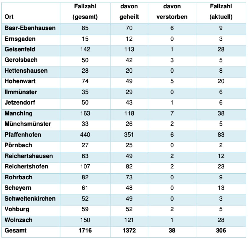 Jeweils wie viele Menschen aus welcher der insgesamt 19 Gemeinden im Landkreis Pfaffenhofen bislang positiv auf das Corona-Virus getestet worden sind, können Sie der tabellarischen Aufstellung in diesem Beitrag entnehmen, die auch heute wieder vom Pfaffenhofener Landratsamt herausgegeben worden ist. "Aufgrund der mittlerweile erhöhten Zahl der Infektionen ist ein unmittelbarer Zusammenhang zu einzelnen infizierten Personen nicht mehr herstellbar", hatte die Behörde dazu erklärt. "Die Persönlichkeitsrechte der Betroffenen sind daher weiterhin geschützt."