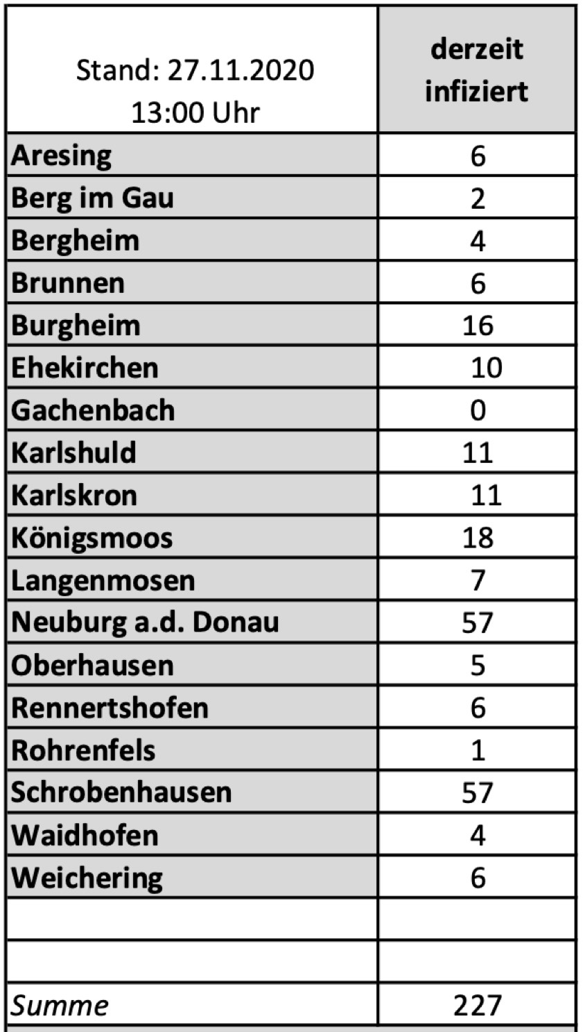 (ty) Im Kreis Neuburg-Schrobenhausen gibt es in Zusammenhang mit der Corona-Pandemie drei weitere Menschenleben zu beklagen. Wie das Landratsamt heute mitteilte erhöht sich damit die Zahl der Landkreis-Bewohner, die mit dem Virus infiziert waren und gestorben sind, auf nunmehr 40. Die weitere Situation in dem Kreis stellt sich nach Angaben des Landratsamts wie folgt dar: Bislang – Stand: heute, 13 Uhr – wurden 1355 Landkreis-Bürger positiv auf den neuartigen Erreger getestet. Die Zahl hat sich seit der gestrigen Meldung um 37 erhöht. Von den Infizierten gelten mittlerweile 1088 als genesen; das sind 35 mehr als gestern. Momentan gibt es in dem Landkreis 227 aktive Corona-Fälle (gestern: 228). Aktuelle Zahlen aus den Gemeinden zeigt die Tabelle unten.