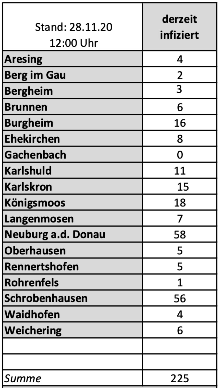 (ty) Im Kreis Neuburg-Schrobenhausen gibt es in Zusammenhang mit der Corona-Pandemie, wie berichtet, mittlerweile 40 Menschenleben zu beklagen. Die weitere Situation in dem Kreis stellt sich nach Angaben des Landratsamts wie folgt dar: Bislang – Stand: heute, 12 Uhr – wurden 1377 Landkreis-Bürger positiv auf den neuartigen Erreger getestet. Die Zahl hat sich seit der gestrigen Meldung um 22 erhöht. Von den Infizierten gelten mittlerweile 1112 als genesen; das sind 24 mehr als gestern. Momentan gibt es in dem Landkreis 225 aktive Corona-Fälle (gestern: 227). Aktuelle Zahlen aus den Gemeinden zeigt die Tabelle unten.