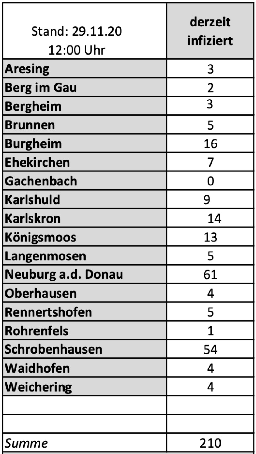 (ty) Im Kreis Neuburg-Schrobenhausen gibt es in Zusammenhang mit der Corona-Pandemie, wie berichtet, mittlerweile 40 Menschenleben zu beklagen. Die weitere Situation in dem Kreis stellt sich nach Angaben des Landratsamts wie folgt dar: Bislang – Stand: heute, 12 Uhr – wurden 1386 Landkreis-Bürger positiv auf den neuartigen Erreger getestet. Die Zahl hat sich seit der gestrigen Meldung um neun erhöht. Von den Infizierten gelten mittlerweile 1136 als genesen; das sind 24 mehr als gestern. Momentan gibt es in dem Landkreis 210 aktive Corona-Fälle (gestern: 225). Aktuelle Zahlen aus den Gemeinden zeigt die Tabelle unten.