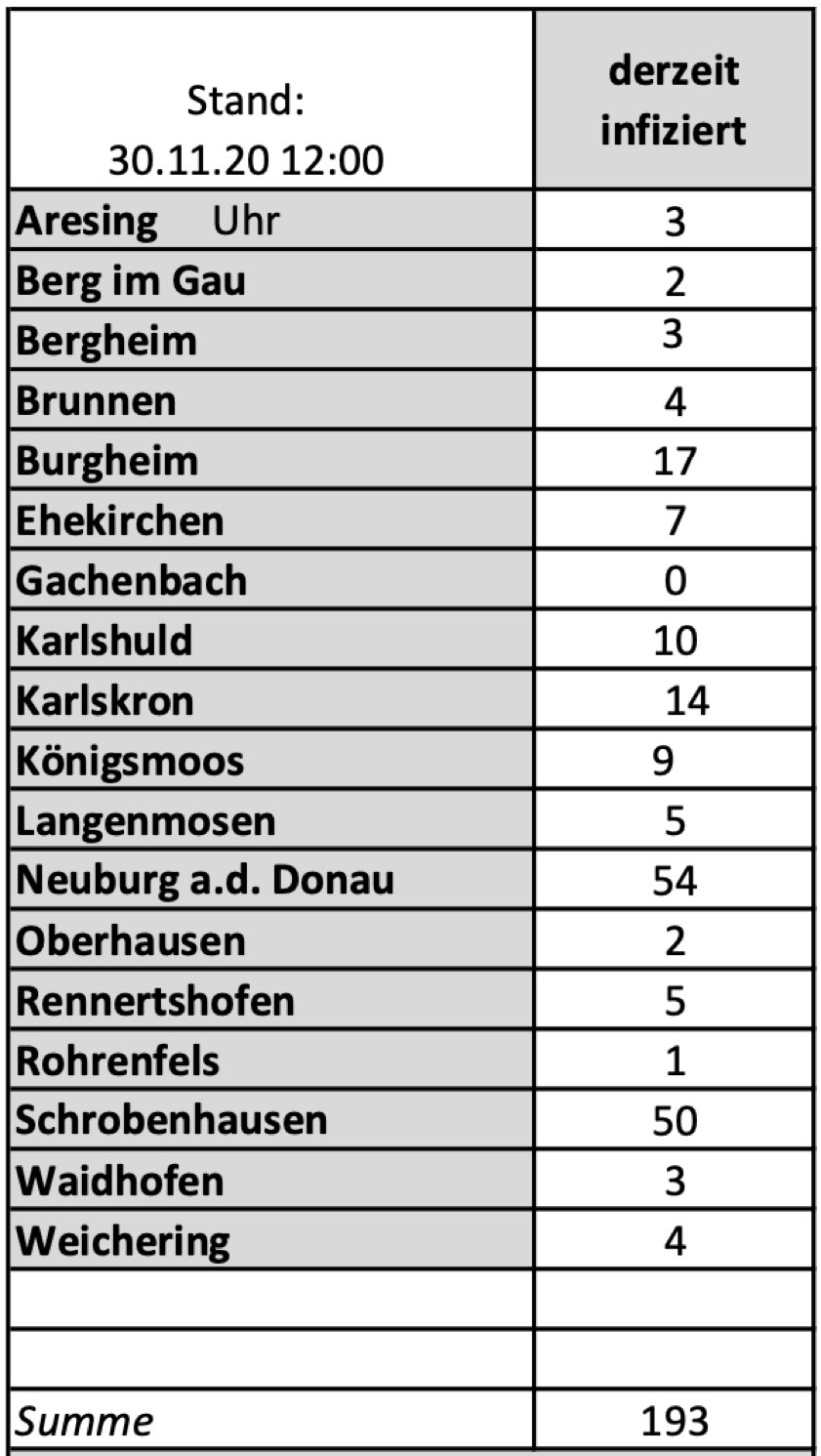 (ty) Im Kreis Neuburg-Schrobenhausen gibt es in Zusammenhang mit der Corona-Pandemie, wie berichtet, mittlerweile 40 Menschenleben zu beklagen. Die weitere Situation in dem Kreis stellt sich nach Angaben des Landratsamts wie folgt dar: Bislang – Stand: heute, 12 Uhr – wurden 1393 Landkreis-Bürger positiv auf den neuartigen Erreger getestet. Die Zahl hat sich seit der gestrigen Meldung um sieben erhöht. Von den Infizierten gelten mittlerweile 1160 als genesen; das sind 24 mehr als gestern. Momentan gibt es in dem Landkreis 193 aktive Corona-Fälle (gestern: 210). Aktuelle Zahlen aus den Gemeinden zeigt die Tabelle unten.