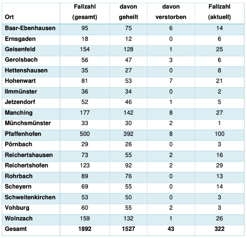 Jeweils wie viele Menschen aus welcher der insgesamt 19 Gemeinden im Landkreis Pfaffenhofen bislang positiv auf das Corona-Virus getestet worden sind, können Sie der tabellarischen Aufstellung in diesem Beitrag entnehmen, die auch heute wieder vom Pfaffenhofener Landratsamt herausgegeben worden ist. "Aufgrund der mittlerweile erhöhten Zahl der Infektionen ist ein unmittelbarer Zusammenhang zu einzelnen infizierten Personen nicht mehr herstellbar", hatte die Behörde dazu erklärt. "Die Persönlichkeitsrechte der Betroffenen sind daher weiterhin geschützt."