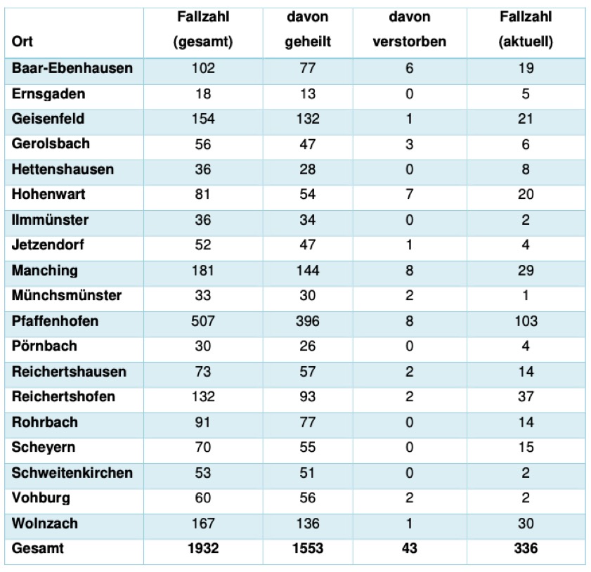 Jeweils wie viele Menschen aus welcher der insgesamt 19 Gemeinden im Landkreis Pfaffenhofen bislang positiv auf das Corona-Virus getestet worden sind, können Sie der tabellarischen Aufstellung in diesem Beitrag entnehmen, die auch heute wieder vom Pfaffenhofener Landratsamt herausgegeben worden ist. "Aufgrund der mittlerweile erhöhten Zahl der Infektionen ist ein unmittelbarer Zusammenhang zu einzelnen infizierten Personen nicht mehr herstellbar", hatte die Behörde dazu erklärt. "Die Persönlichkeitsrechte der Betroffenen sind daher weiterhin geschützt."