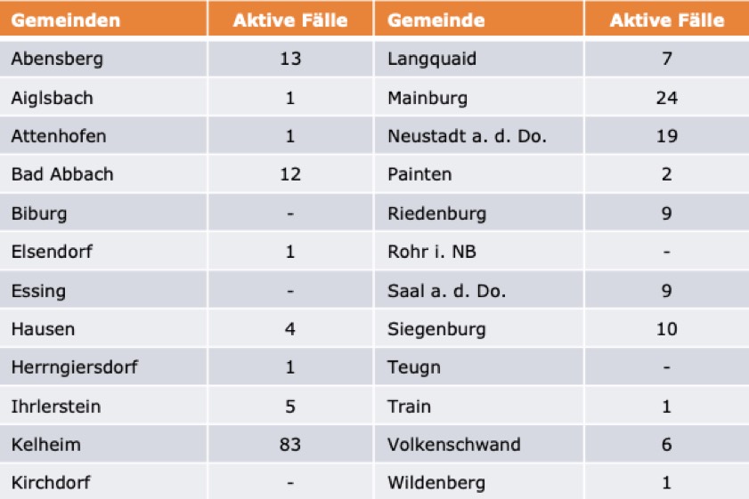 (ty) Im Kreis Kelheim gibt es in Zusammenhang mit der Corona-Pandemie, wie berichtet, mittlerweile 39 Menschenleben zu beklagen. Unter Verweis auf Daten des Gesundheitsamts teilte das Landratsamt heute mit, dass – Stand gestern, 16 Uhr – die Zahl der im Kreis Kelheim positiv auf den neuartigen Erreger getesteten Menschen bei insgesamt 1760 liegt – das sind 33 mehr als gestern gemeldet. 1512 hiesige Corona-Patienten (gestern: 1492) gelten mittlerweile als genesen und sind aus der Quarantäne entlassen. Derzeit gibt es 209 aktive Corona-Fälle im Landkreis (gestern: 196). Zahlen aus den einzelnen Gemeinden zeigt die Tabelle unten.