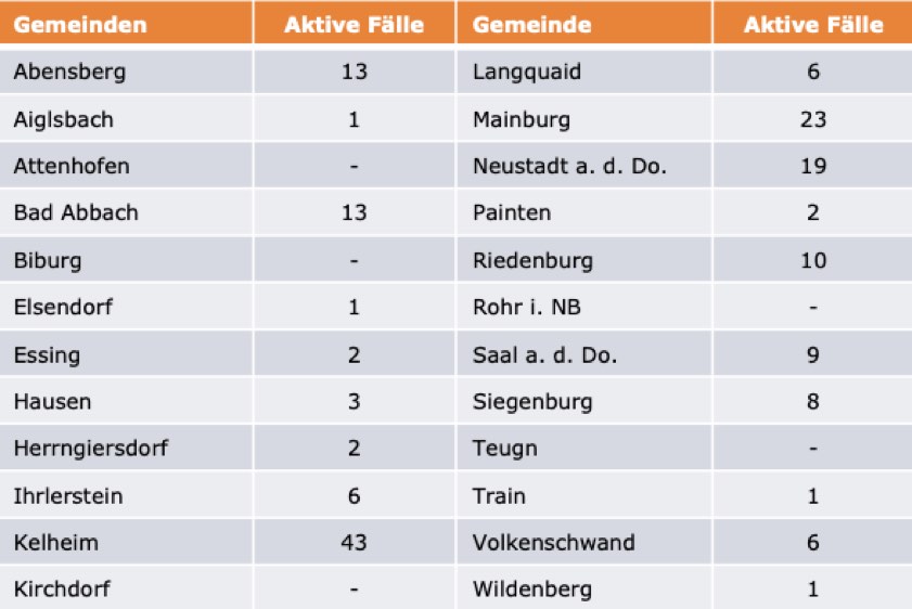 (ty) Im Kreis Kelheim gibt es in Zusammenhang mit der Corona-Pandemie, wie berichtet, mittlerweile 39 Menschenleben zu beklagen. Unter Verweis auf Daten des Gesundheitsamts teilte das Landratsamt heute mit, dass – Stand gestern, 16 Uhr – die Zahl der im Kreis Kelheim positiv auf den neuartigen Erreger getesteten Menschen bei insgesamt 1778 liegt – das sind 18 mehr als gestern gemeldet. 1570 hiesige Corona-Patienten (gestern: 1512) gelten mittlerweile als genesen und sind aus der Quarantäne entlassen. Derzeit gibt es 169 aktive Corona-Fälle im Landkreis (gestern: 209). Zahlen aus den einzelnen Gemeinden zeigt die Tabelle unten.