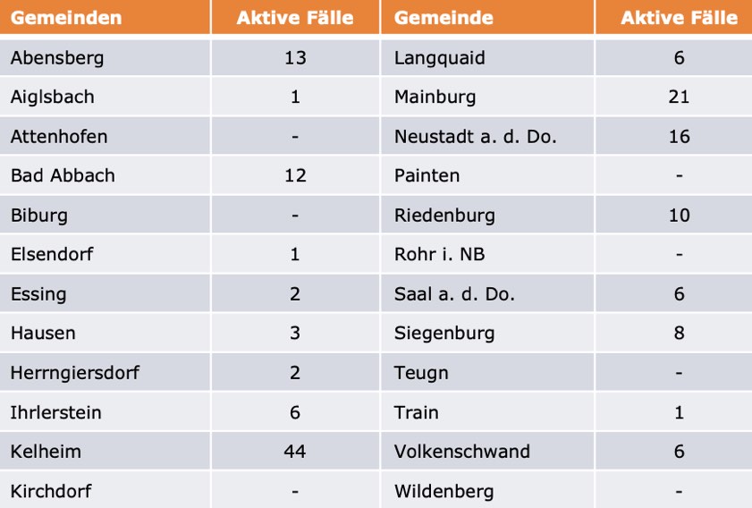(ty) Im Kreis Kelheim gibt es in Zusammenhang mit der Corona-Pandemie, wie berichtet, mittlerweile 39 Menschenleben zu beklagen. Unter Verweis auf Daten des Gesundheitsamts teilte das Landratsamt heute mit, dass – Stand gestern, 16 Uhr – die Zahl der im Kreis Kelheim positiv auf den neuartigen Erreger getesteten Menschen bei insgesamt 1784 liegt – das sind sechs mehr als gestern gemeldet. 1587 hiesige Corona-Patienten (gestern: 1570) gelten mittlerweile als genesen und sind aus der Quarantäne entlassen. Derzeit gibt es 158 aktive Corona-Fälle im Landkreis (gestern: 169). Zahlen aus den einzelnen Gemeinden zeigt die Tabelle unten.
