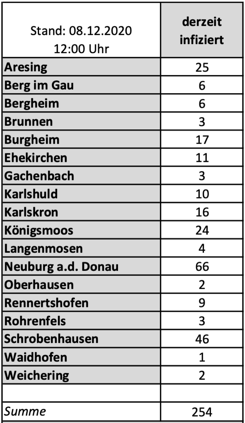 (ty) Im Kreis Neuburg-Schrobenhausen gibt es in Zusammenhang mit der Corona-Pandemie, wie berichtet, mittlerweile 41 Menschenleben zu beklagen. Die weitere Situation in dem Kreis stellt sich nach Angaben des Landratsamts wie folgt dar: Bislang – Stand: heute, 12 Uhr – wurden 1617 Landkreis-Bürger positiv auf den neuartigen Erreger getestet. Die Zahl hat sich seit der gestrigen Meldung um 40 erhöht. Von den Infizierten gelten mittlerweile 1322 als genesen; das sind 21 mehr als gestern. Momentan gibt es in dem Landkreis 254 aktive Corona-Fälle (gestern: 235). Aktuelle Zahlen aus den Gemeinden zeigt die Tabelle unten.